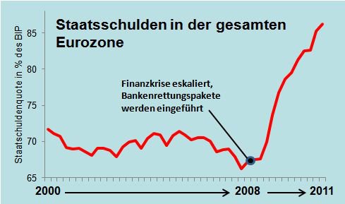 Druhý graf ukazuje, jak raketově narůstá zadlužení eurozóny a s tím spojený nárůst nezaměstnanosti v celé EU, neboť nasazená úsporná opatření kosí jedno pracovní místo za druhým. Viz graf dluhů eurozóny.
