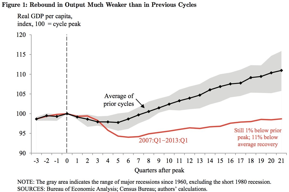 Další graf studie usvědčuje ze lži všechny české hlasatele neoliberálních světlých zítřků a tzv. „brzkého oživení ekonomiky“. Rozkradené banky, zničené úspory, ekonomika dluhu a měna rozvrácená virtuálním finančním šmejdem způsobily, že ekonomické ozdravení je nejpomalejší v celé historii. To ukazuje následující graf studie porovnávající bývalá pozvednutí z recese a současný stav.