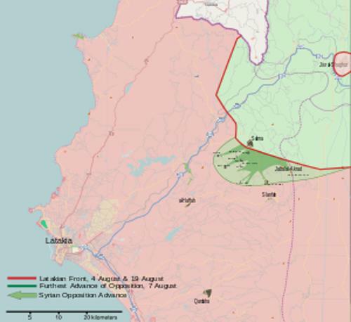V minulém čísle Fakta o Sýrii XI. aneb Kdo válčí a proč jsme ukázali spojení tzv. odboje do Islámské aliance. Ta dnes z velké části ovládá syrské povstání proti Asadovi a dostává hlavní zahraniční pomoc. Jsou to najatí žoldnéři, cizinci a z části i mezinárodně hledaní teroristé. Sunnitští Syřani se dnes v mnoha částech země dobrovolně vzdali a vrátili domů, protože se nemohou dívat na zvěrstva páchaná na civilních obyvatelích. Klasickým příkladem byla krátká ofenzíva v Latákiji, kdy povstalci na několik dní dobyli protiútokem několik vesnic a zmasakrovali v nich stovky místních civilistů, žen i dětí. Mapu nyní již zmařeného útoku ze srpna 2013 máte zde.