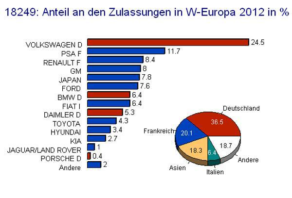 Německo je na svůj automobilový průmysl náležitě pyšné. 37 % všech nově přihlášených osobních aut v západní Evropě jde na konto německých značek, 20 % je francouzských a 18 % připadá na asijské značky – viz graf.