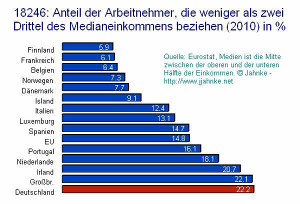 Proti 750 tisícům zaměstnanců v trvalém pracovním poměru, kde je hodinová sazba trojnásobkem levných mezd, stojí v Německu armáda 100 000 agenturních pracovníků za minimální mzdu a 250 000 zaměstnanců na smlouvu o dílo. Podle reportáže ARD o situaci u firmy Daimler, činí mzda těchto lidí 8,19 eur za hodinu. Německo má, jak vyplývá z druhého grafu Eurostatu největší podíl pracovníků s nejnižšími mzdami v celé západní Evropě, kteří vydělávají méně než jsou 2/3 mediánu mezd. S takovými mzdami se pochopitelně dá dobře konkurovat a na to poukazují především Francouzi. Jak špatně jsou na tom němečtí dělníci, to ukazuje tento graf.