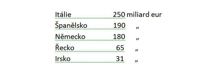 V roce 2014 bude potřeba refinancovat i jednoduché krátkodobé úvěry. Různé „stínové“ pomoci do tohoto balíku ani nejsou zahrnuty. Itálie by měla vracet 264,5 mld., Francie 170 mld., Španělsko 114 mld., Portugalsko 27 mld., Irsko 6 mld., Kypr 3 mld. (zdroj Bloomberg, Geolitico.de)
