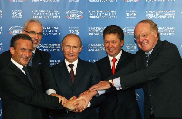 Na obrázku při uzavírání smlouvy o Southstream jsou hlavní představitelé společného podniku: Alexej Miller (Gazprom), Paolo Scaroni (ENI), Henri Proglio (EDF), Harald Schwager (BASF).