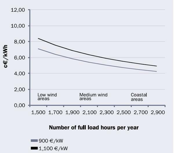 Nejprve se podívejme na graf nákladů na produkci elektřiny podle místa výhodnosti dané větrem. Graf je spočítán podle reálných výsledků dnes již technologicky zastaralé generace větrníků starých 10 let, které ovšem budou dalších 20 let v provozu. Ty dnešní mají mnohem vyšší účinnost, menší hlučnost a také delší životnost.