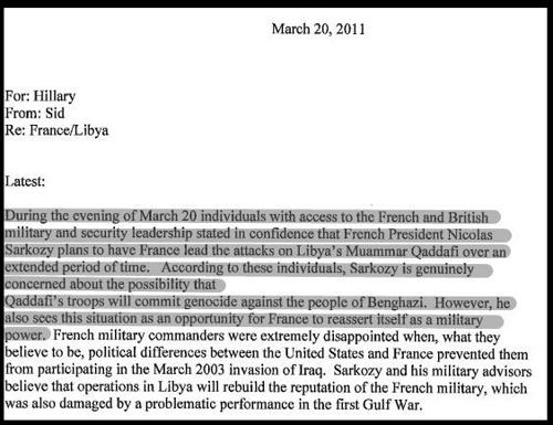 Maily Clintonové ukazují, že válku v Libyi spojenou se současnou masivní vlnou uprchlíků do EU chtěl osobně tehdejší francouzský prezident Nicolas Sarkozy. Američané se k ní přidali z důvodů útoku na konzulát v Benghází (2012), s nímž ovšem Kaddáfí neměl nic společného. Tady je klíčový mail dokazující osobní zájem Sarkozyho na rozvrácení Libye.