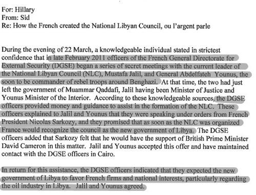 Clintonové posílal tyto maily její poradce a novinář Sidney Blumenthal, který si dnes už bohužel na nic nepamatuje. Měl zprávy od veterána CIA jménem Tyler Drumheller, který si pro změnu pamatuje dost, protože opustil CIA v roce 2005. Odsoudil manipulace Bushovy vlády ohledně druhé války v Iráku a šel pryč. Klíčovým faktem pro Francouze je, že tyto poznámky usvědčují Sarkozyho ze lži ohledně války v Libyi.