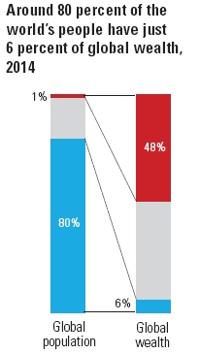Rozložení bohatství ve světě přesně ukazuje tento graf. Celkem 80 % lidí vlastní pouze 6 % bohatství země. A naopak 1 % planetárních zbohatlíků vlastní 49 % planetárních zdrojů.