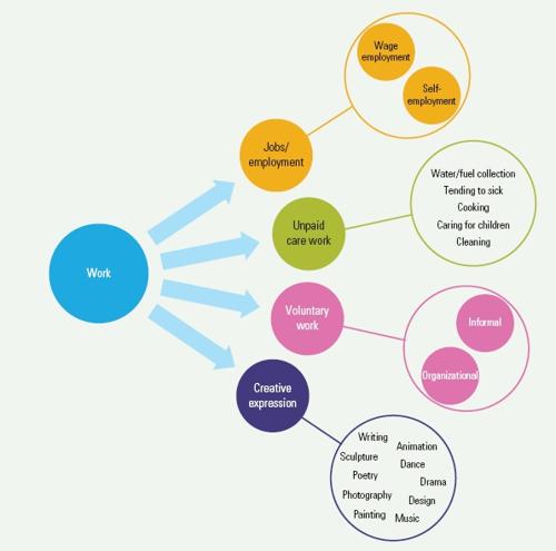 Dvě polokoule ukazují zásadní závislost. Lidsky důstojná práce daná ve středu kruhu osobně obohacuje jednotlivce a ten zase zlepšuje život celé komunity. Proto je důstojná práce a její podmínky tak důležitá pro život člověka. A proto se o ní ve věku globálních montoven a korporátního fašismu nemluví nahlas. Nejzajímavější je tento celkový graf.