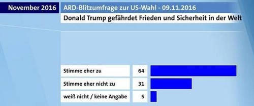 Celkem 64 % dotázaných se domnívá, že Donad Trump škodí míru a bezpečnosti ve světě. Kdyby to ale byli jenom diváci ZDF a ARD, pro který se tento průzkum konal! Co předvádí propagandou zmasírovaná německá učitelská inteligence, to se snad nedá ani srovnat s poměry v bývalé NDR! Na některých školách a gymnáziích v Německu se děti psychicky hroutí a jsou „šokovány“, že byl zvolen ten šílený sexista, rasista a islamofob Trump. Když děti tak věřily a fandily Hillary Clintonové a na její podporu připravovaly v rámci školních projektů ve školách řadu akcí! Protože Hillary prý ochrání naši Evropu od války s Ruskem. Studenti a děti vedly ohnivé diskuse, skládaly ve škole posměšné písničky na adresu Donalda, a nyní jsou zoufalé a dezorientované, viz tento web. Fakt síla. Nebylo příliš těžké domyslet si, proč nakonec zvítězí Donald Trump.