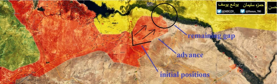 Podívejte se na červenou, což je Asad a jeho iráčtí spojenci. Asadovi legendární Tygři projeli s tanky za jeden den až k hranici Iráku. Měli předem ujednanou dohodu se šíitskými jednotkami podporovanými Íránem People's Mobilization Forces (PMF) nebo jinou zkratkou Popular Mobilization Units (PMU) , které v téže době vymlátily teroristy Al-Núsry od irácké strany hranice. Tato ozbrojená milice s iráckou regulérní armádou dobyla Mosúl a považují USA za zrádce. USA za wahabitské peníze evakuovali velitele al-Núsry z území Fallúdže obklíčené iráckou armádou. Američané a jimi podporovaní teroristé placení skrze CIA a cvičení v Jordánsku skončili v Al-Tanfu v úplném obklíčení. A stejná situace se nyní stala v Kurdům u Rakky, kde je SAA obklíčila na vysunuté proamerické zóně za Eufratem. Tygři z SAA nyní zabírají ropná a plynová pole a postupují směrem na Deir-es-Zor. Ten mimochodem nebrání alavitský generál od Asada, ale legendární palestinský generál Issam Zahredin, který pochází z palestinských uprchlíků vyhnaných Izraelem. Těchto uprchlíků se velkoryse ujal Asad v Sýrii a oni mu za to pomohli dobýt Aleppo. Jak vidět, prozíravá uprchlická politika se dlouhodobě vyplácí. Dokonce i Československo za vlády komunistů to dobře vědělo.