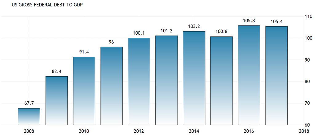 Podle grafu to znamená, že turecká ekonomika se stala tureckým hospodářstvím během jednoho týdne! Vzhledem k tomu, že jde o zemi se 70 mil. obyvatel, která funguje jako Česko a je montovnou EU, to není pravděpodobné. Podle propočtů německých ekonomů DW je reálný růst ekonomiky podobný jako v Čině, tedy 6,1 % v roce 2015, 3,4 % v roce 2016 a dokonce 7,4 % v roce 2017. Export stoupl z 85 miliard EU (2010) na 130 mld. EU v roce 2017. Takže růst v exportní podobě je silný a Česko má v postkoloniálním korporátním otroctví co dohánět. A přestože v Turecku prakticky nikdo neplatí daně a oficiálně nepracuje, tak není důvod k obavám. Za prvé a zásadně by se hodnota liry měla odvíjet od tureckého dluhu v porovnání s HDP země. Tak se na to podívejme.