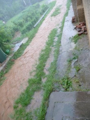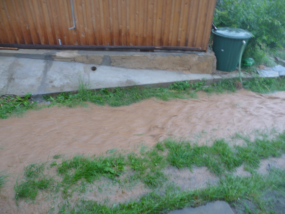 Teď chci jen říct, že to není jednoduché. Tedy zastavit tu vodu, co utekla. Můj odhad proudu kolem mého zápraží byl 200 l za minutu a za 30 minut deště je to 6 kubíků vody, které utekly do Slabeckého potoka a posléze do Berounky, na níž není přehrada.