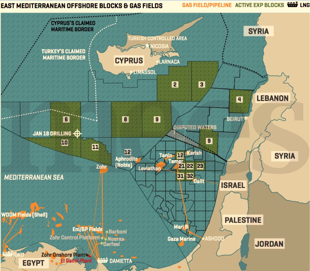 Druhý důvod je také jasný, a o ten se bojuje v Libyi, viz nedávný článek Dnešní Libye a Vondrovo ProMoPro aneb Rozdíl mezi městskou a korporátní legendou. Podívejte na ropná a plynové pole ve Středomoří, která spadají do oblasti výlučných ekonomických zón (EEZ) vzdálených 370 km (200 námořních mil) od pobřeží dané země.