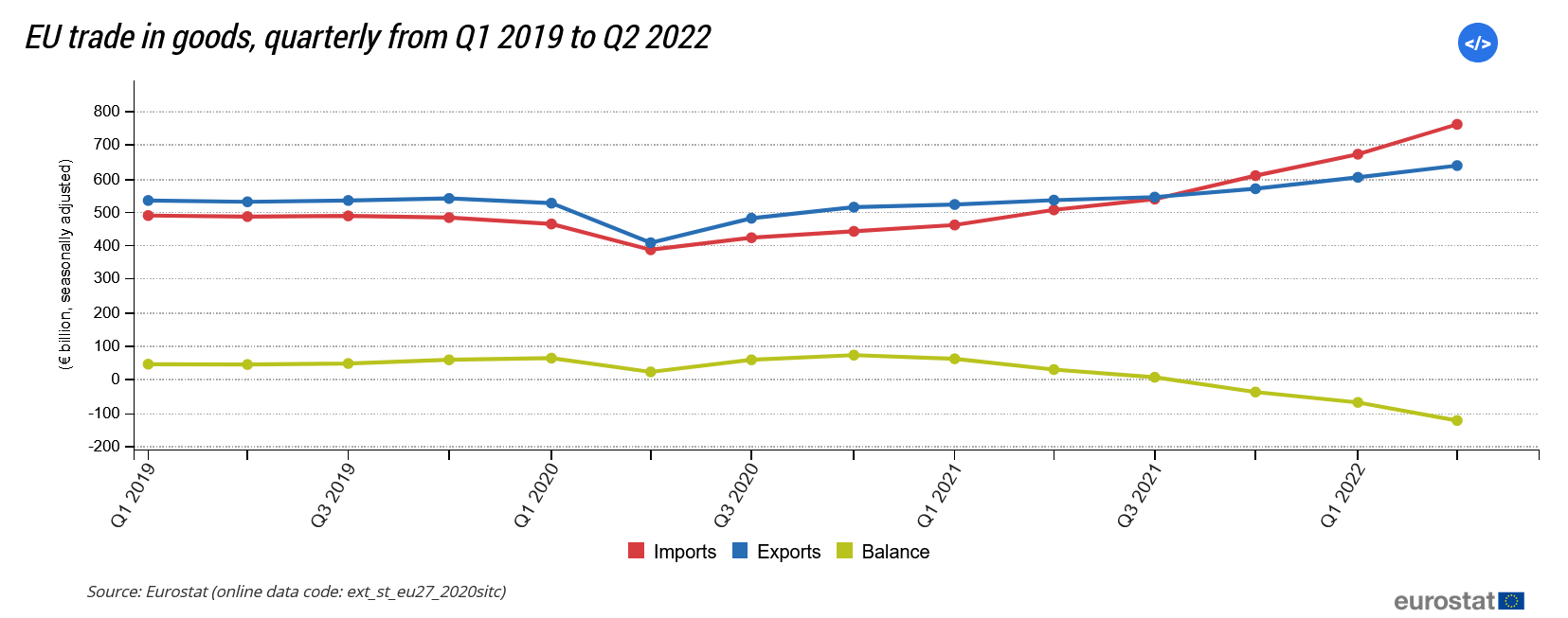 Komentář ministerstva zahraničního obchodu k těmto "výsledkům" je velmi jednoduchý, viz článek (ZDE). Výroba na export je závislá na dovozech surovin a komponent a při současném stavu je ztrátová. Hezky česky to znamená, že jde o ztrátu konkurenceschopnosti. Nyní se podívejme na bilanci EU, kde je vidět podobná nerovnováha exportu a importu. Viz graf "EU trade in goods, quarterly from Q1 2019 to Q2 2022".