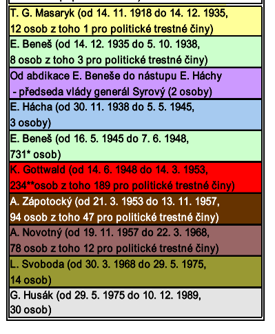 Do tohoto výčtu nejsou samozřejmě zařazeny stovky tisíc obětí německé okupace občanů Protektorátu Čechy a Morava ani obětí ukrajinské SS Galizia, oddílů OUN Stepana Bandery či dalších útvarů obnovujících německý pořádek na území Slovenského štátu v souvislosti s činností nacistů a potlačením Slovenského národního povstání. Relativně vysoký počet popravených za prezidentování E. Beneše je dán retribučními dekrety namířenými proti zrádcům a kolaborantům s německými fašisty. Právní čistotu podle dnešních měřítek v nich nehledejme. Jednak byli obžalovaní souzení podle paragrafů se zpětnou platností a jednak jim byla odepřena možnost odvolání.