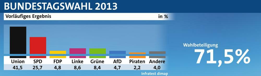 Na levici jasně posílila skutečná levice Die Linke a naopak upadli Zelení (Grüne), a to ze dvou důvodů. Jednak je doběhla jejich minulost květinových dětí, kteří hlásali jako jejich šéf Trittin v místních volbách v Göttingen (1981), že konsensuální sex s nezletilými není trestný čin. A na druhou stranu jim Merkelová zavřením atomovek vyfoukla hlavní trumf. A sociální témata měla už dávno obsazená levice, takže přehození kormidla doleva nepřineslo žádný efekt. U německých Zelených se musí začít doopravdy přemýšlet a budou tam jistě padat hlavy, protože touto porážkou odejde celá jedna generace zakladatelů zelených. Námi sledovaná Pirátská strana uspěla průměrně. Pěkný výsledek by byl 3 %, fantastický 5 %, tj. vstup do Parlamentu. Celkový obrázek rozdělení mandátů máte zde.