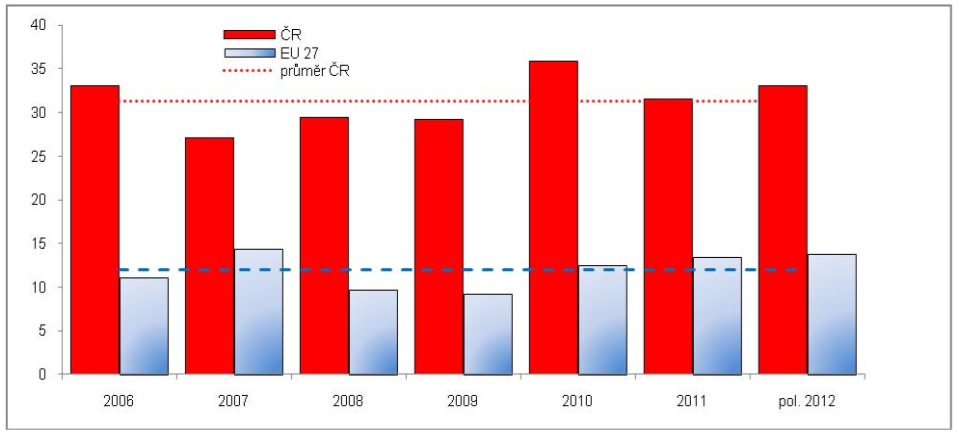 Ale pozor, podíl potravin ve spotřebním koši postupem času klesá a přibližuje se průměru EU 27 (tj. 13,9 % v roce 2012). V Česku jsme na 14,4 % za rok 2012 z celkových výdajů domácností, ale v roce 2008 to bylo ještě 17,1 %. Zato zásadně stoupá podíl výdajů na bydlení a na energie v celkových výdajích domácností ČR (18 % v roce 2012; 16 % v roce 2008). Tento růst je mnohem rychlejší než v EU 27 (16,1 % v roce 2012; 15 % v roce 2008). Jinak řečeno: nepromyšlené daňové kutilství našich vlád způsobilo, že růst životních nákladů je u nás mnohem vyšší než je průměr EU 27.