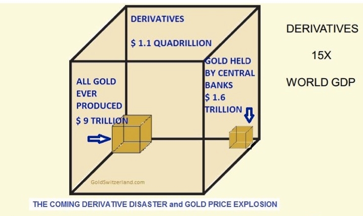 Takže Spojené státy si berou peníze z celého světa, pak je rozfofrují ve velké bankovní loupeži zvané „hypotéční krize“. To je ten zlom v modré v roce 2008, kdy to US-banksteři rozkradli i našim tunelářům. Viz článek Pohádka o hypotéční Karkulce a nenažraném Vlkovi-Banksterovi. Nakradl jste vy a někdo okradl vás. Ale jedno procento se hojí na zbytku 99 procent, tak to není tak bolestné. Hůře je tom můj budoucí důchod a vaše případné a zcela jistě devalvované úspory. A nyní jdeme k tomu podstatnému, o čem jsme už mnohokrát psali. Viz třeba článek o derivátech (Vznik a vláda globálních parazitů). Tam vidíte růst virtuálních peněz, které nejsou ničím kryté a dnes představují patnáctkrát větší hodnotu než je HDP celé zeměkoule. Porovnejte si to s celkovou vytěženou sumu zlata a s aktuálním zlatým depozitem v bankách.