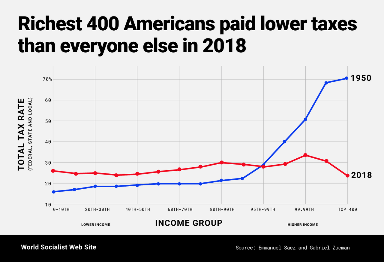 Světová organizace opravdu pomáhající chudým se jmenuje Oxfam. Podle její zprávy za rok 2019 platí, že 2,153 miliardářů světa má více bohatství než 4,6 miliardy lidí, kteří tvoří 60 procent populace planety. To znamená, že dvě tisícovky lidí mají víc majetku, než polovina lidí celé Země. Čech s korunou a virem v peněžence má co závidět. Ale mne zajímá, jestli tato skupina finančních super-oligarchů platí daně a kam peníze ukládají. Tak pojďme k daním v USA, kde je vliv jednoho promile hodně vidět. Tento graf ukazuje, jak si 400 superbohatých v USA zařídilo ráj na zemi. |