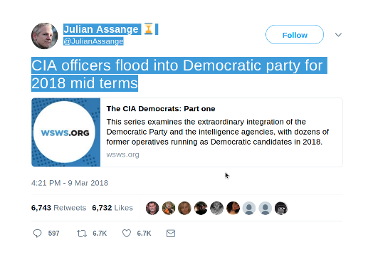 Aleš MacháčekPodle senzační nové zprávy World Socialist Web Site, na níž ve svém tvítu odkázal zakladatel WikiLeaks Julien Assange, usilují o nominaci na kandidátku Demokratické strany pro volby do Sněmovny reprezentantů bývalí zpravodajci a vojáci ze CIA, Pentagonu, Národní bezpečnostní rady a ministerstva zahraničí. V roce 2018 se ve Spojených státech budou konat volby do dolní komory Kongresu, v nichž se Demokratická strana chystá převzít většinu. Mají ji k tomu pomoci i bývalí zpravodajci, kterých je na kandidátkách více než polovina. Pokud by se to stalo, bude to bezprecedentní příval zpravodajců do řad amerických legislativců. Jedním z kandidátů je Abigail Spanbergerová usilující o nominaci na kandidátku Demokratické strany v Richmondu. Svou minulostí se netají: